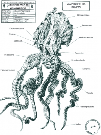 The biologists here know that there actually does exist a creature named the vampire squid from hell. It is a cephalopod, but not exactly a squid – it is considered a living fossil, the single member of the class vampyromorphida – and has enough traits shared by either by octopuses and squids to be considered a primordial cephalopod. It is about six inches in length, and inhabits the sunless, oxygen-minimum layer of the deep ocean. Not only is the vampire squid not a squid, it is even less a vampire. It is a detritivore, feeding on what is called “marine snow,” the detritus and excretions of organic matter that drift down from higher ocean levels. It acquired its name because of its dark, capelike mantle and ferocious appearance, but in this world it is a small, harmless sea-creature with almost as much in common with jellyfish as with real squids.