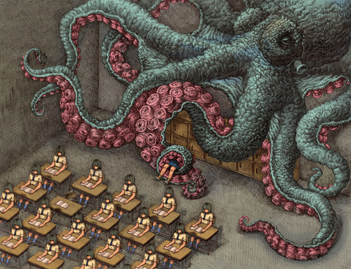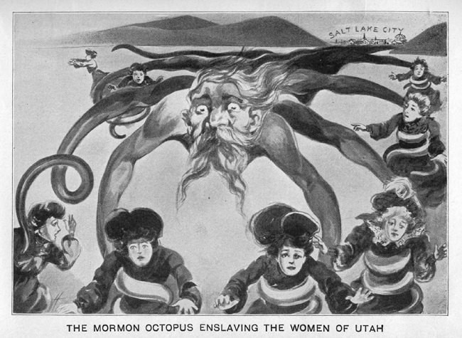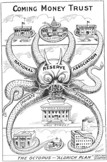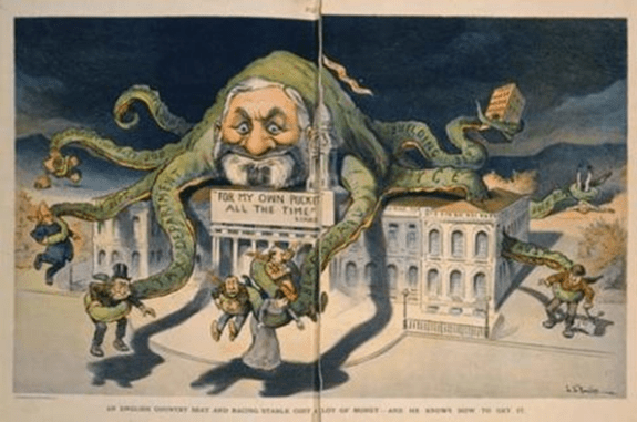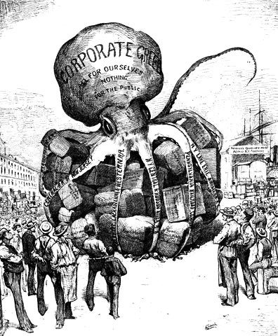 Melville and his generation did not know enough about great squids to develop their iconography. Even the scrupulous Jules Verne, whose sea-monster attacks the submarine Nautilus (tellingly, a mechanical pseudo-cephalopod) in 20,000 Leagues Under the Sea, wavered in his explanation of his own creation between a giant squid and a giant octopus. The octopus eventually became an autonomous cultural trope symbolizing monopoly capitalism, imperialism, Communism, the Jewish global finance conspiracy, Wall Street, etc. The physique of the octopus — all head and tentacles, acquisitiveness incarnate – was perfect for the iconography of all-grasping and entangling states, corporations, and cabals.