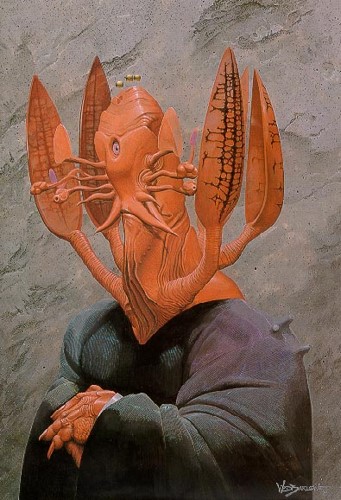 Literary sf has many hybrid variants: Medusa-sluglike Ooloi of Octavia Butler’s Xenogenesis trilogy, cybernetic flies of Stanislaw Lem’s The Invincible, intelligent flatworms of Hal Clement’s Mission of Gravity, mosquito-humans of China Mieville’s The Scar, extraterrestrial turtles of Le Guin’s Lathe of Heaven and many more. SF artists have been inspired to construct images of ever-more sophisticated alternative evolutions, leading to intelligent alien agents in radically different zooforms. Here is my favorite, by the celebrated fantastic artist, James Barlowe: